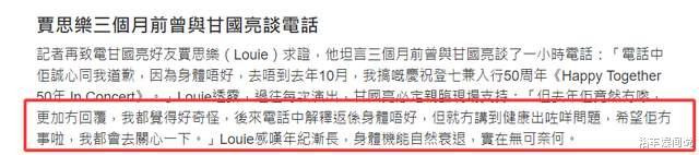 贾思乐表示,三个月前他曾与甘国亮有过一次通话,因为自己要举行演唱会,并邀请对方,过往每次,甘国亮都会现身支持,但上一次却没有现身,原因则是身体出现了一些情况。