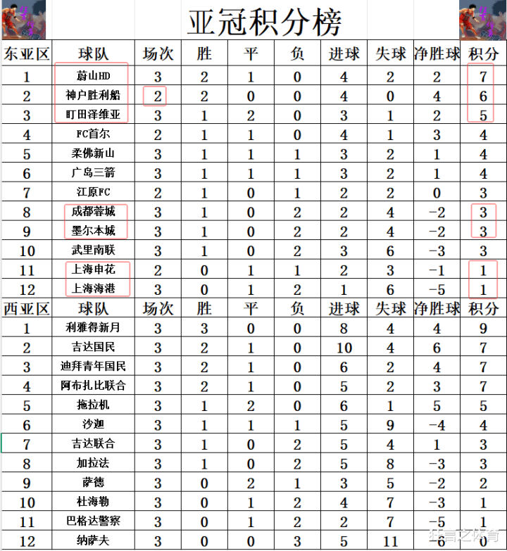 积分榜方面,东亚区,蔚山HD2胜1平暂时超过神户胜利船登顶,盯田泽维亚客场击败上海海港后1胜2平位列第3。墨尔本城昨晚赢球止住2连败,他们也就摆脱了垫底,和成都蓉城并列第8,3轮只拿到1分的中超冠军上海海港成了新的副班长。西亚区,利雅得新月3战全胜领跑,吉达国民,迪拜青年国民,阿布扎比联合2胜1平紧随其后。