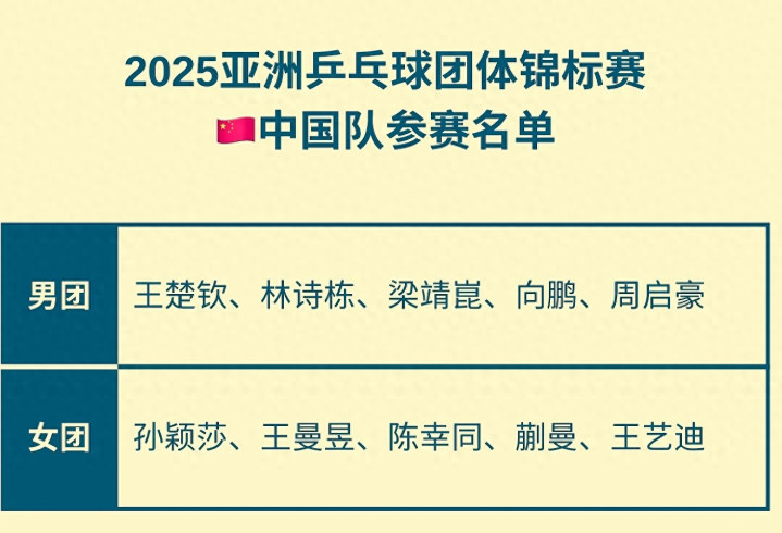 2025亚洲乒乓球锦标赛将于10月11日-10月15日在 印度布巴内斯瓦尔举行,9月21日晚,中国乒协公示了团体赛报名名单,具体如下——