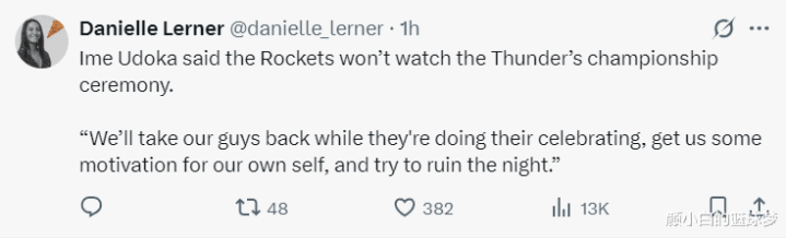 在颁奖仪式开始前,火箭全队纷纷退场,乌度卡在采访中明确表态:我们不会参与他们的总冠军颁奖仪式,趁他们在庆祝的时候我们会进入更衣室,我们要给自己一点动力,尽量搞砸他们的颁奖典礼。