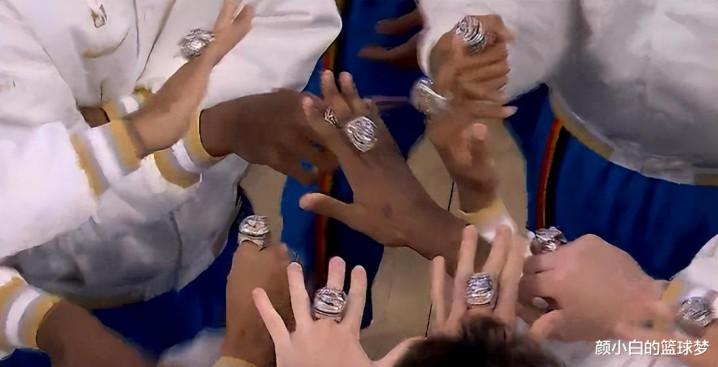 SGA是压轴出场的,他戴上戒指后,全队都在一起展示总冠军戒指,今年的戒指有些不同是双层戒指。