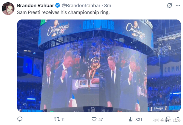 北京时间10月22日,俄克拉荷马雷霆队迎来了总冠军颁奖仪式,雷霆GM普雷斯蒂领取了属于他的总冠军戒指,全场的球迷为普总响起了巨大的呐喊声,因为在雷霆夺冠后,他接连续约了SGA、霍姆格伦、杰威三位球队核心。